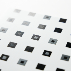 4つの印刷加工によって、ひとまわり小さい正方形をランダムに重ねています。