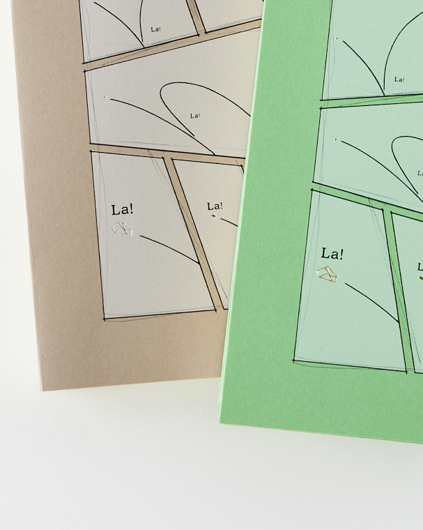鉛筆描きのラフのような線はスミ1色、枠線や曲線、「La!」「Sha~」といったオノマトペの部分は黒の箔押しにすることで、