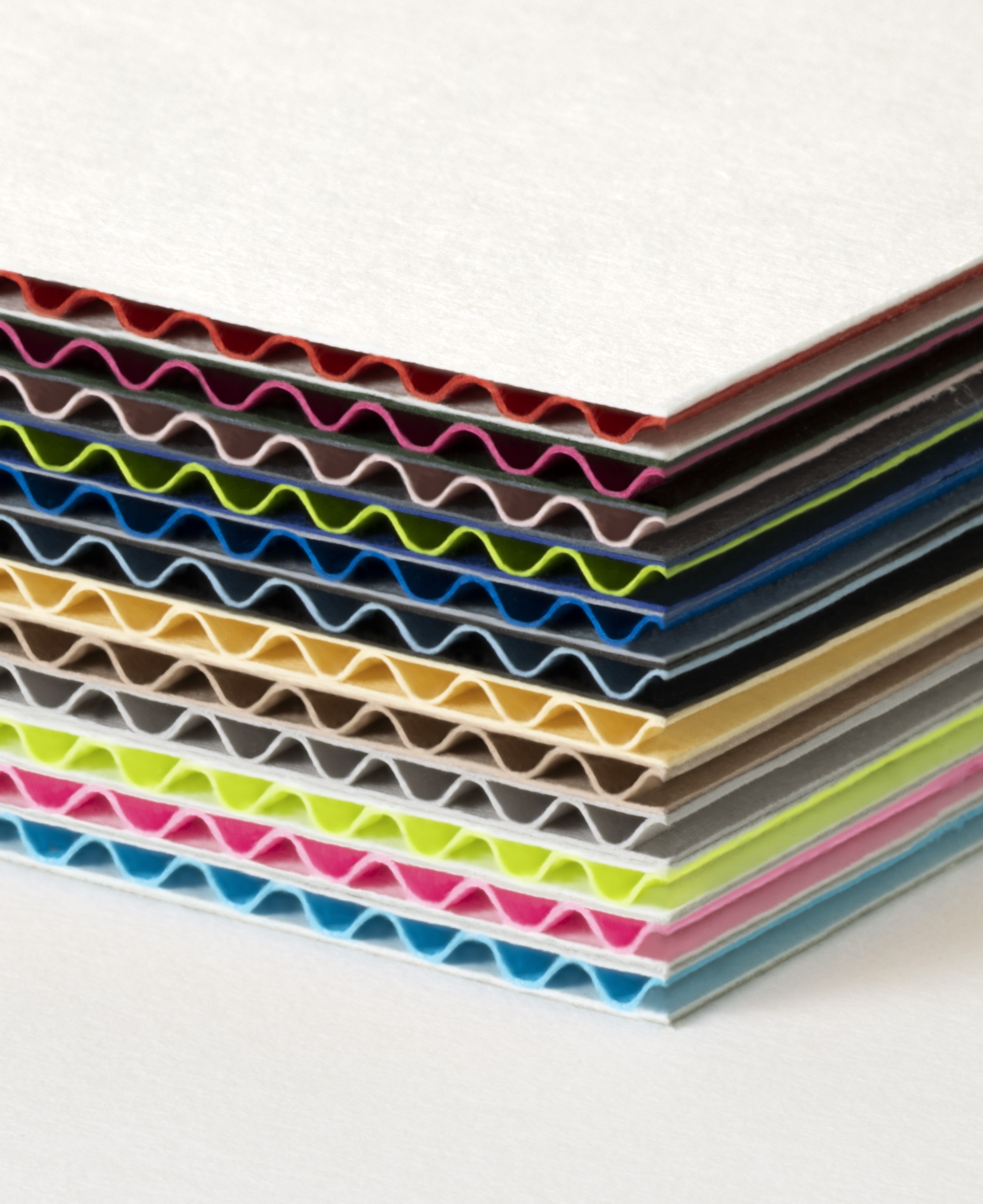 このたび、新たにライナー(表裏)に古紙由来のチリの入った灰色、フルート(波状の中芯)に蛍光色を使用した3色が加わり、